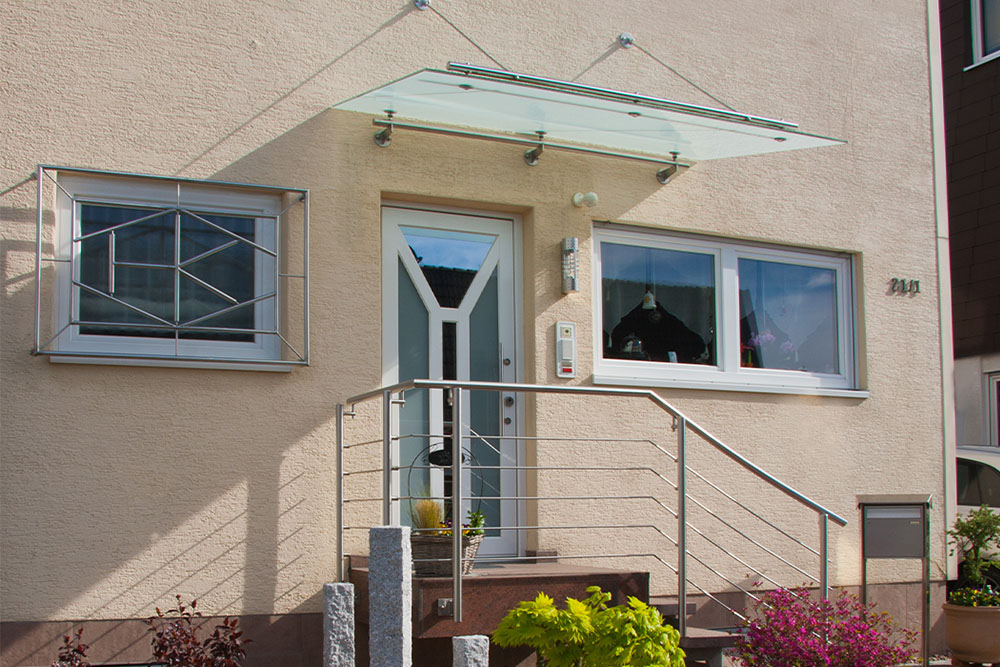 Vordächer sind primär Wetterschutzelemente für Personen und Bausubstanz. Ein Vordach bewahrt Ihre Eingangstür vor direktem Niederschlag und UV-Strahlung – die Rutschgefahr auf den Stufen wird direkt vorm Eingangsbereich minimiert. Unterschiedliche Materialien wie Aluminium, Glas, Edelstahl und Holz (auch in Kombination) sorgen für eine helle, moderne und elegante Optik.